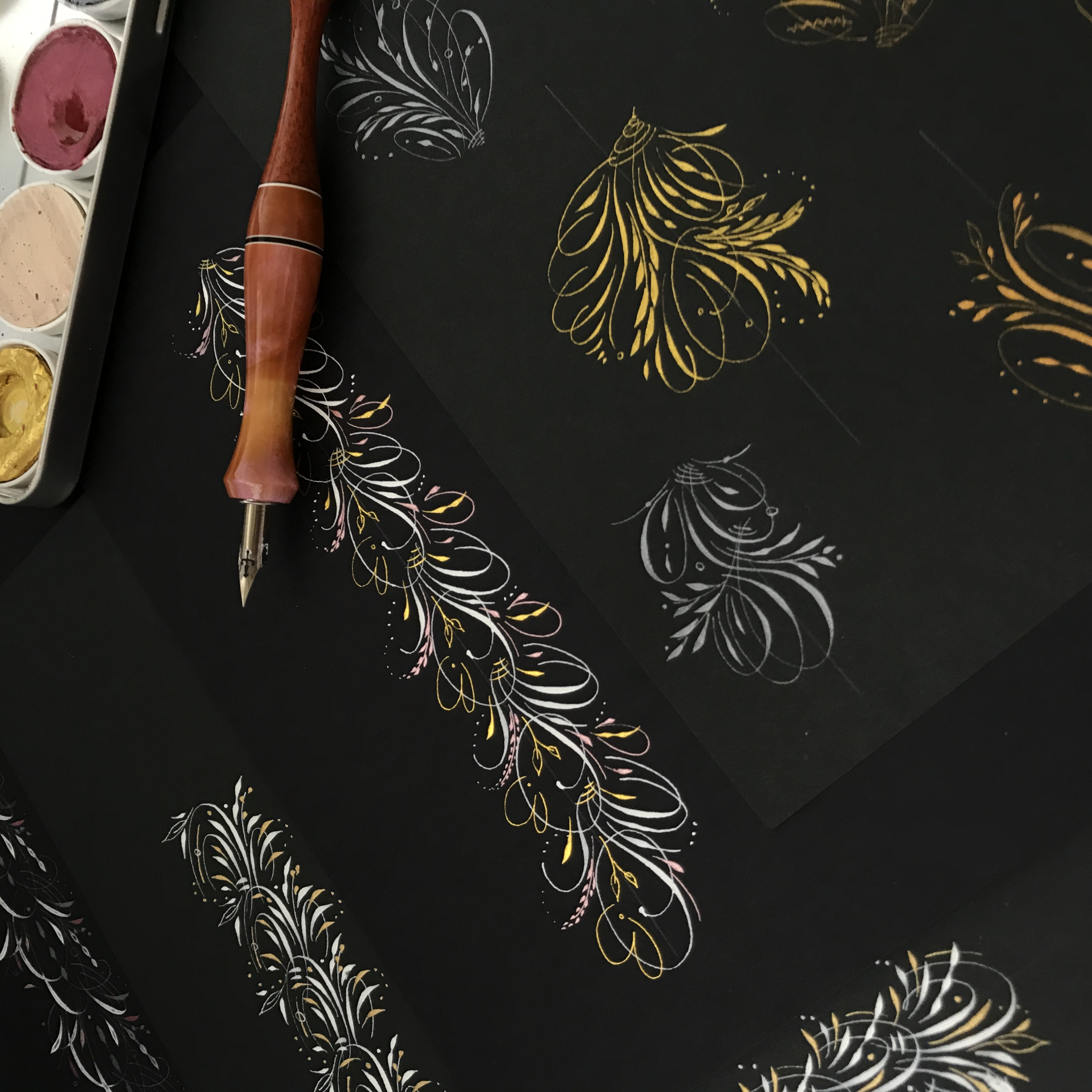 I love working for brands, doing on site calligraphy jobs and writing invitations to their events. At the moment, I am working on an envelope job for a wedding. I love working with different papers and inks for each project.