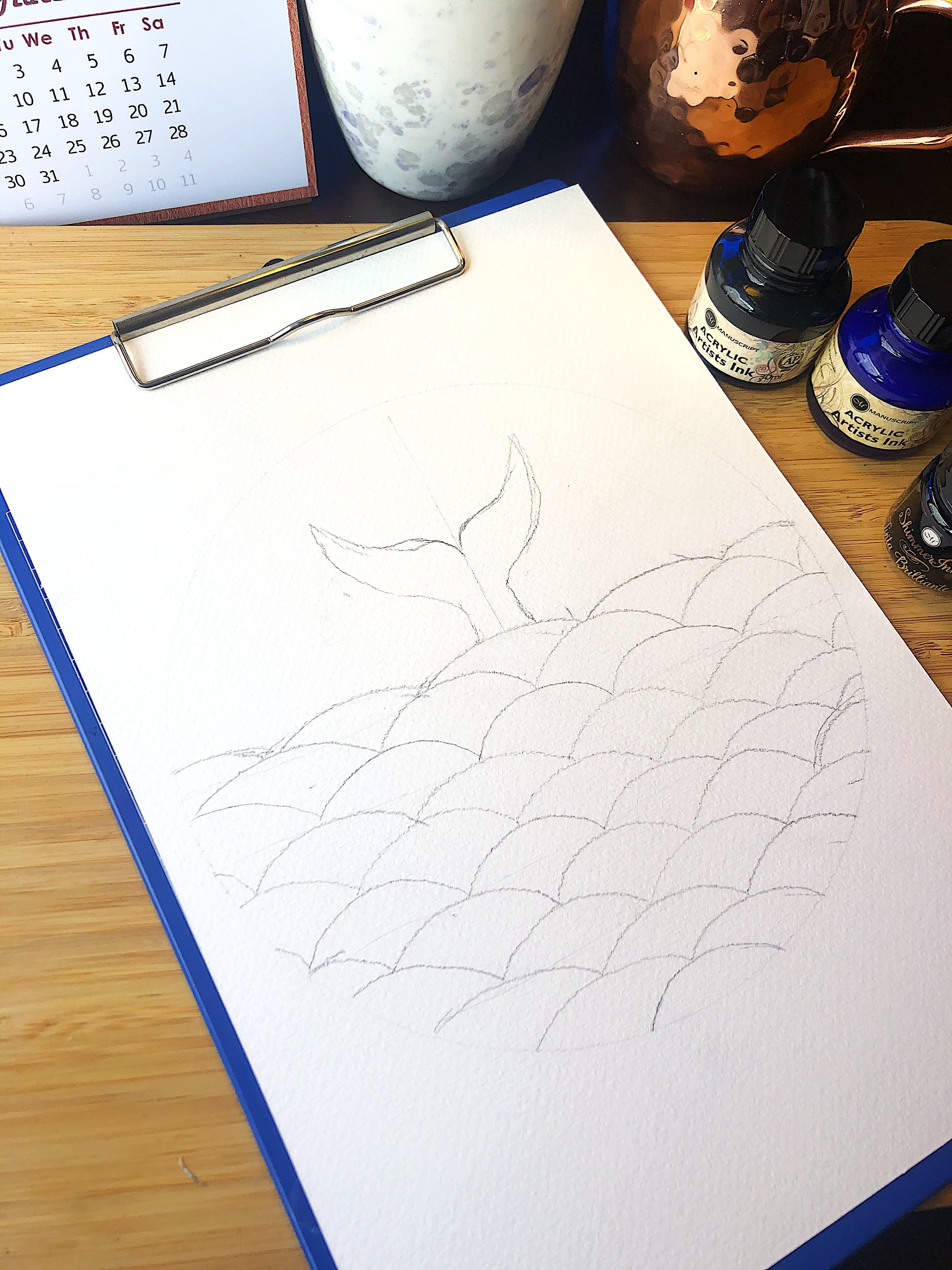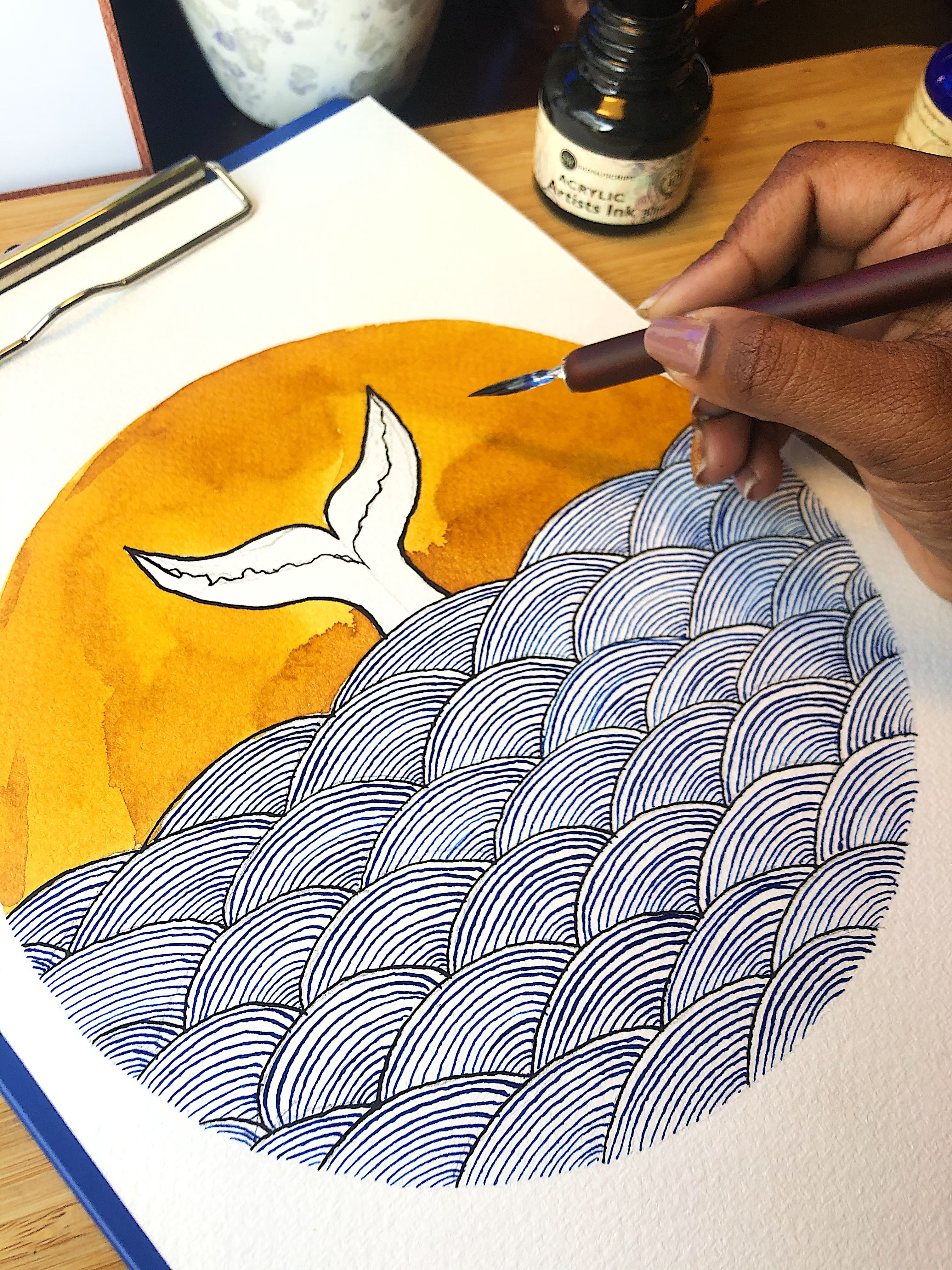 Like working with pencil, I started working on outline of waves and the whale’s tail, with the former in blue and our giant marine mammal in black.