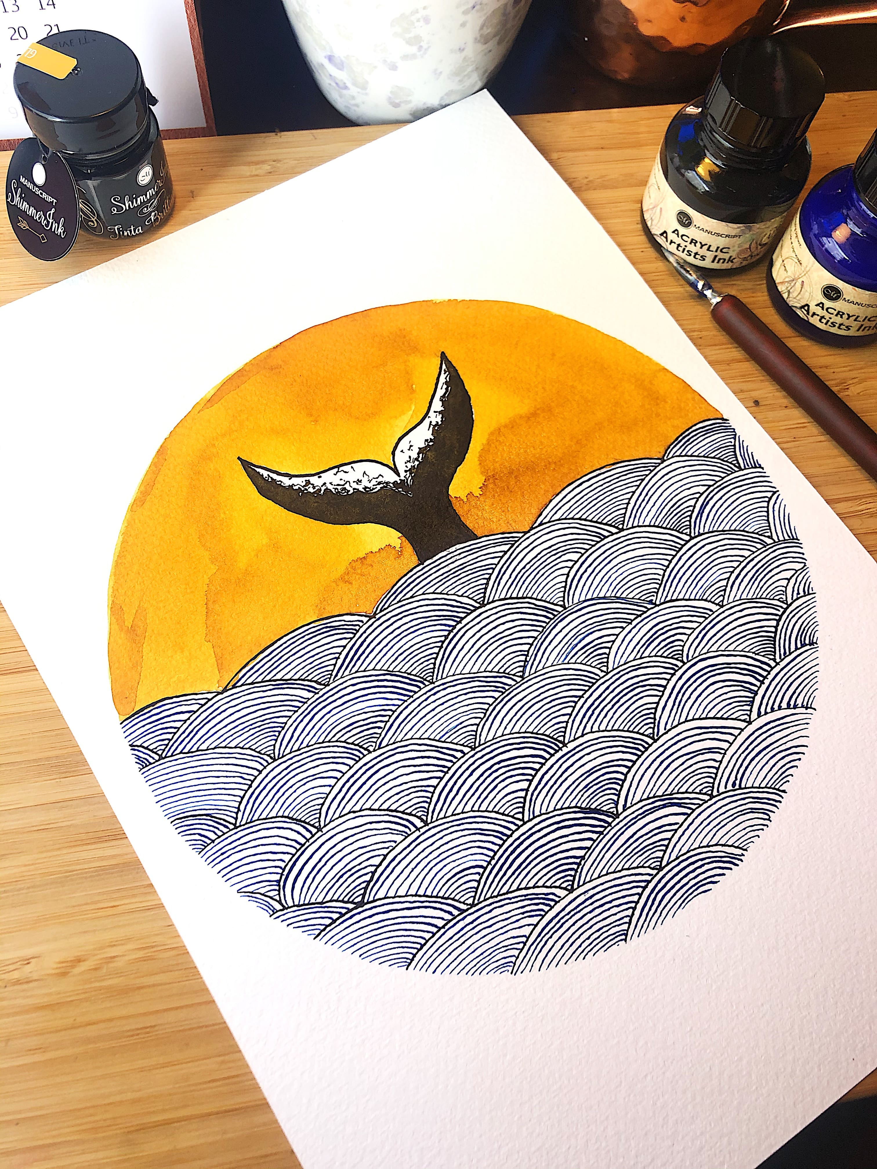 As we seem to have non-stop rain at the moment, I’ve channelled my own inner sunshine to create a beautiful piece of a whale diving back into the sea.